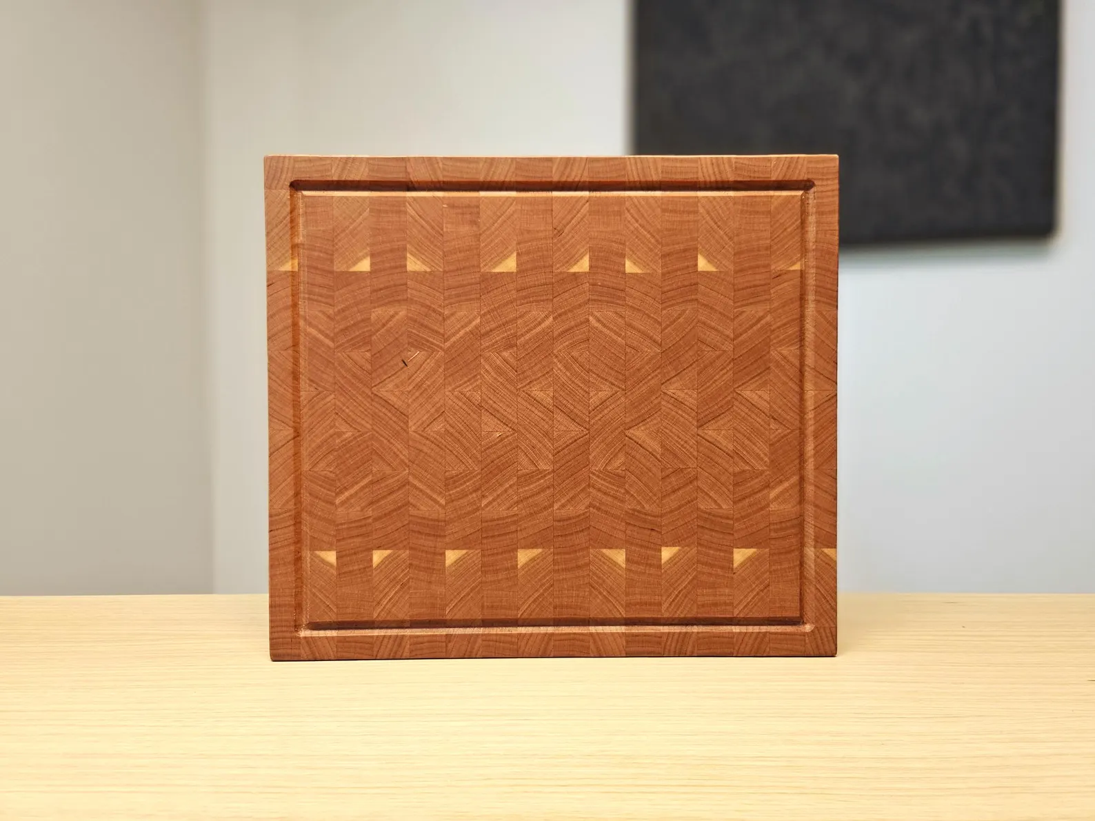 ℹ️ This end grain cutting board is made of pure cherry wood. It is simple, yet one of my favourites. Its durability and natural food-safe materials makes it a great choice for both cutting and food serving. Metal/rubber legs are added for extra stability.
